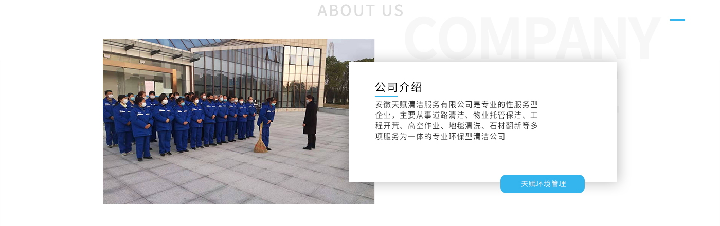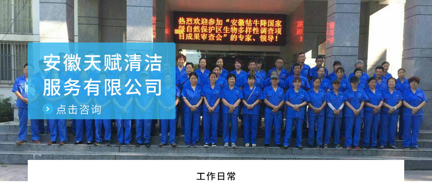 安徽天賦清潔服務(wù)有限公司是的服務(wù)型企業(yè),主要從事道路清潔、物業(yè)托管保潔、工程開荒、高空作業(yè)、地毯清洗、石材翻新等多項(xiàng)服務(wù)為一體的環(huán)保型清潔公司。公司管理機(jī)制完善,清潔作業(yè)經(jīng)驗(yàn)豐富,擁有技術(shù)力量,嚴(yán)格實(shí)行崗前培訓(xùn)—崗中督查—上崗在培訓(xùn)的員工管理措施,憑著優(yōu)良的清潔質(zhì)量和嚴(yán)格的督查管理,為眾多企事業(yè)單位、醫(yī)院、酒店、廠區(qū)商場(chǎng)、物業(yè)、道路、學(xué)校、公園等提供后勤清潔服務(wù)。在業(yè)內(nèi)擁有良好的口碑。工作人員,服務(wù)態(tài)度優(yōu),竭力為客戶提供好的保潔服務(wù)。安徽天賦清潔服務(wù)有限公司:致力于長(zhǎng)期合作關(guān)系,提高服務(wù)質(zhì)量,提供高標(biāo)準(zhǔn)的清潔服務(wù)。公司的經(jīng)營(yíng)理念:為營(yíng)造一個(gè)更清潔、亮麗的生活和工作環(huán)境而努力!“誠信”是公司成功保證?!翱蛻糁辽希抛u(yù)為首”是公司宗旨。高標(biāo)準(zhǔn)提供服務(wù),維護(hù)客戶利益、形象,是我始終不渝的目標(biāo)。